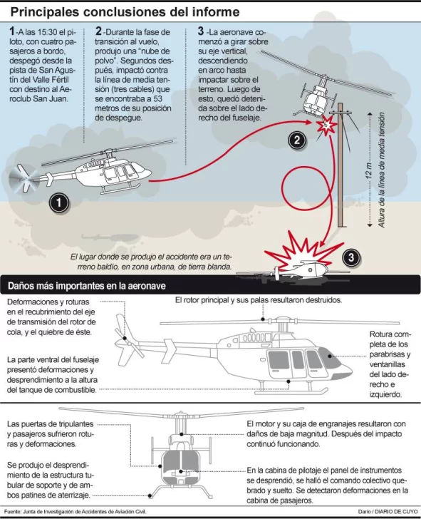 El informe final de la Junta de Investigación de Accidentes de Aviación Civil (JIAAC) sobre el accidente del helicóptero oficial de la Gobernación en Valle Fértil dejó al piloto Aníbal Touris en la mira. Señala que la nube de polvo producida por el despegue produjo "desorientación" de quien comandaba la aeronave, debido a una "inadecuada planificación e iniciación del vuelo en un área no debidamente preparada para una operación segura".