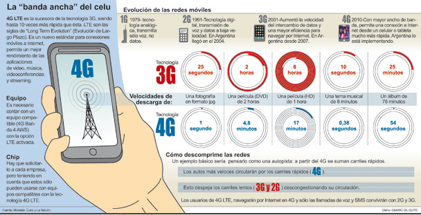 Actualmente la red 3G es la única vía por la que se transmite la voz, mensajes de texto, videos o música por Internet. Con la llegada de 4G ambas compartirán el espectro radioeléctrico sin afectarse entre sí (como la radio AM y FM) pero la 4G servirá para transmitir solamente datos, es decir, toda la navegación por Internet (videos, música, videoconferencias o streaming); con una velocidad hasta 10 veces más rápida que con 3G.