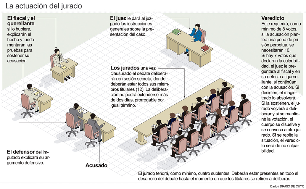 En el estrado estarán ubicados 12 personas, que tendrán diferentes profesiones o inclusive algunos pueden estar desempleados. Serán hombres y mujeres de distintas edades, de formaciones diversas y con sus respectivas creencias y experiencias. Esos ciudadanos conformarán un jurado y tendrán la misión de ser uno de los eslabones clave para impartir justicia, ya que son los que decidirán si un sospechoso es culpable o no de un delito, mientras que el juez fijará la pena en el caso de una condena. Eso sí, los jurados intervendrán en causas graves, que causen gran impacto público, como homicidios, violaciones seguidas de muerte, la aplicación de torturas por parte de un funcionario y un robo seguido de muerte, por ejemplo. Es que el proyecto de ley que impulsa el Gobierno establece que participarán en casos cuya pena máxima del delito exceda los 20 años de cárcel.
