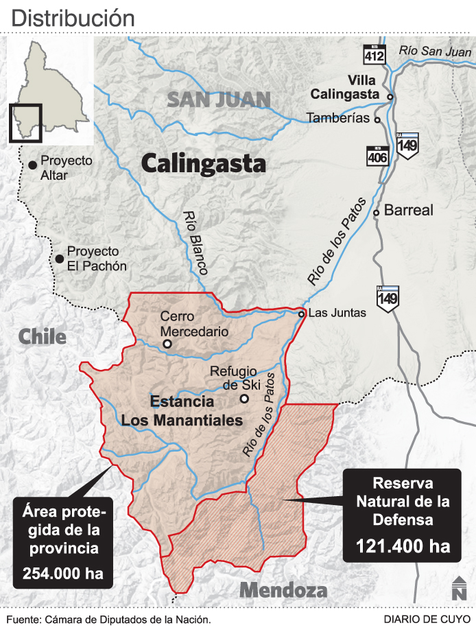 El acuerdo al que arribó la gestión uñaquista trajo solución al conflicto que se presentó a principio de año, luego de que el diputado nacional santafesino Germán Martínez presentara un proyecto para declarar como Reserva Natural de la Defensa a una serie de regiones del país, entre las que se encontraba las más de 375 mil hectáreas de Los Manantiales. De haber avanzado ese proyecto, la extensa área en el suroeste de la provincia, en el límite con Mendoza y Chile, hubiera quedado enmarcada con estrictas prohibiciones como "la explotación agropecuaria", "la instalación de todo tipo de industria, sea o no contaminante", "la exploración minera" y "los asentamientos humanos, sean permanentes o no", entre otros. Dicha situación iba a afectar las actividades económicas que ya realizan unas 400 familias, las que están vinculadas a la agricultura y el turismo, además de limitar la expansión de futuros emprendimientos en esos rubros.