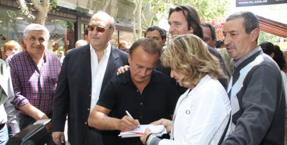 La recorrida arrancó en Tucumán y Laprida y se prolongó hasta avenida Central, pero fue a paso lento porque apenas la gente lo descubría se acercaba a saludarlo, darle un beso o pedirle el autógrafo. Y a nadie le dijo que no con una amplia sonrisa. Incluso se paraba en las mesas de los cafés y él mismo se metía entre las sillas para saludar a los clientes.