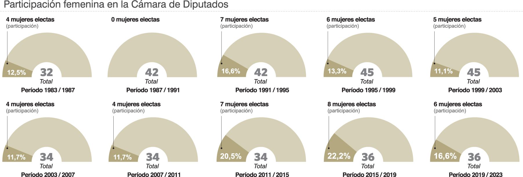 En 1994, se sancionó la ley de cupo femenino, que establecía un piso del 30 por ciento de candidatas mujeres, pero que no obligaba a que estuvieran entre los primeros puestos. La cifra más alta fue la de 2015 con el 22,2 por ciento. Con la norma de paridad de género, las nueve diputadas electas llegaron al 25 por ciento y, con los reemplazos, alcanzarán el 33,3 por ciento.