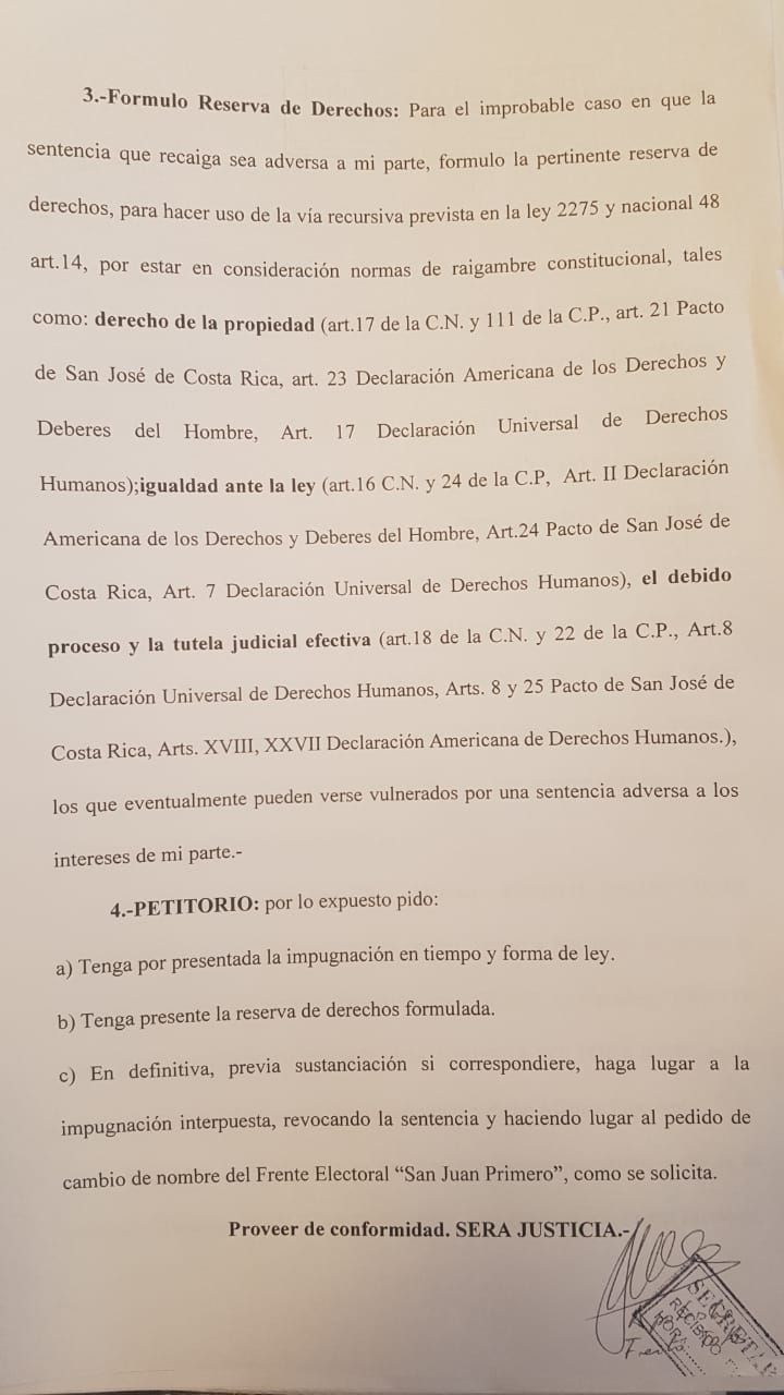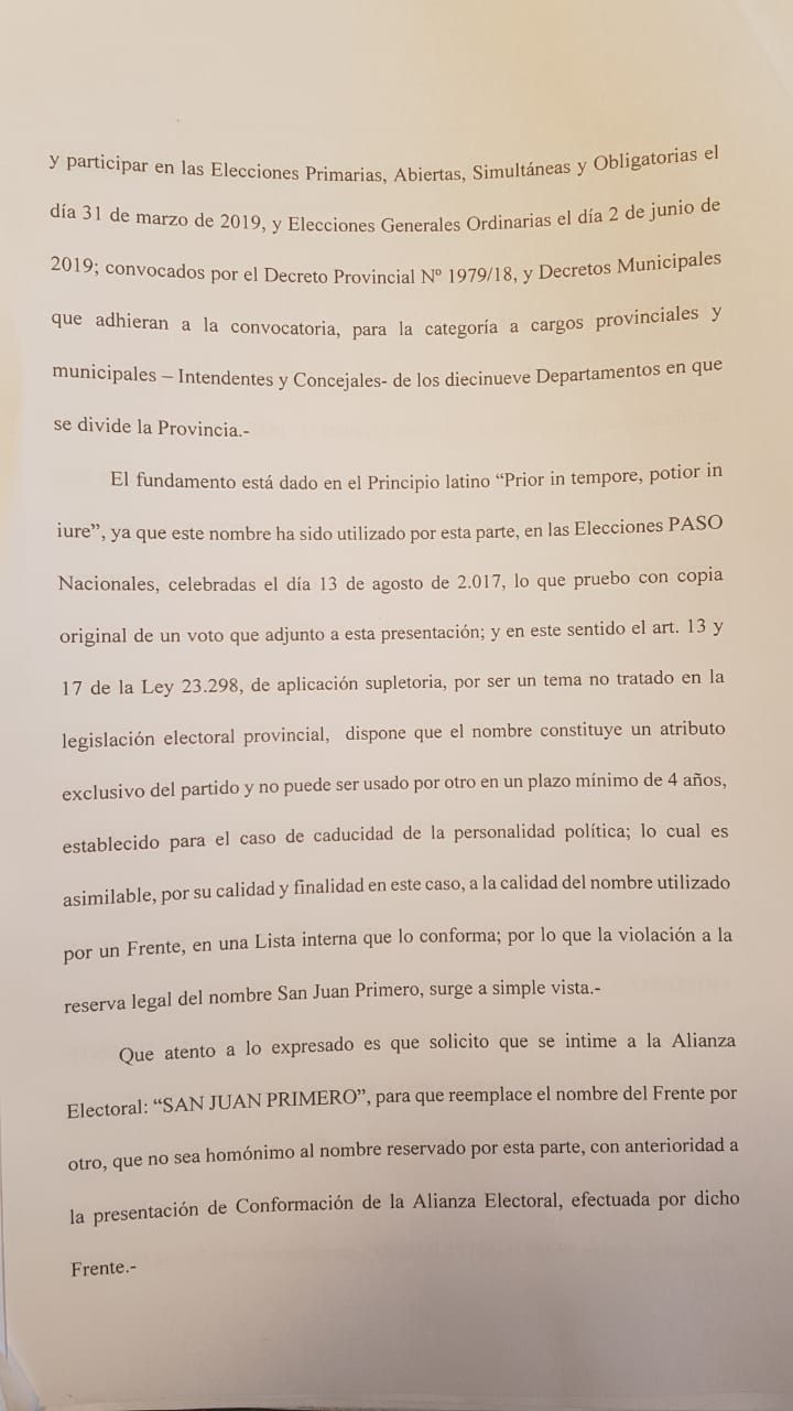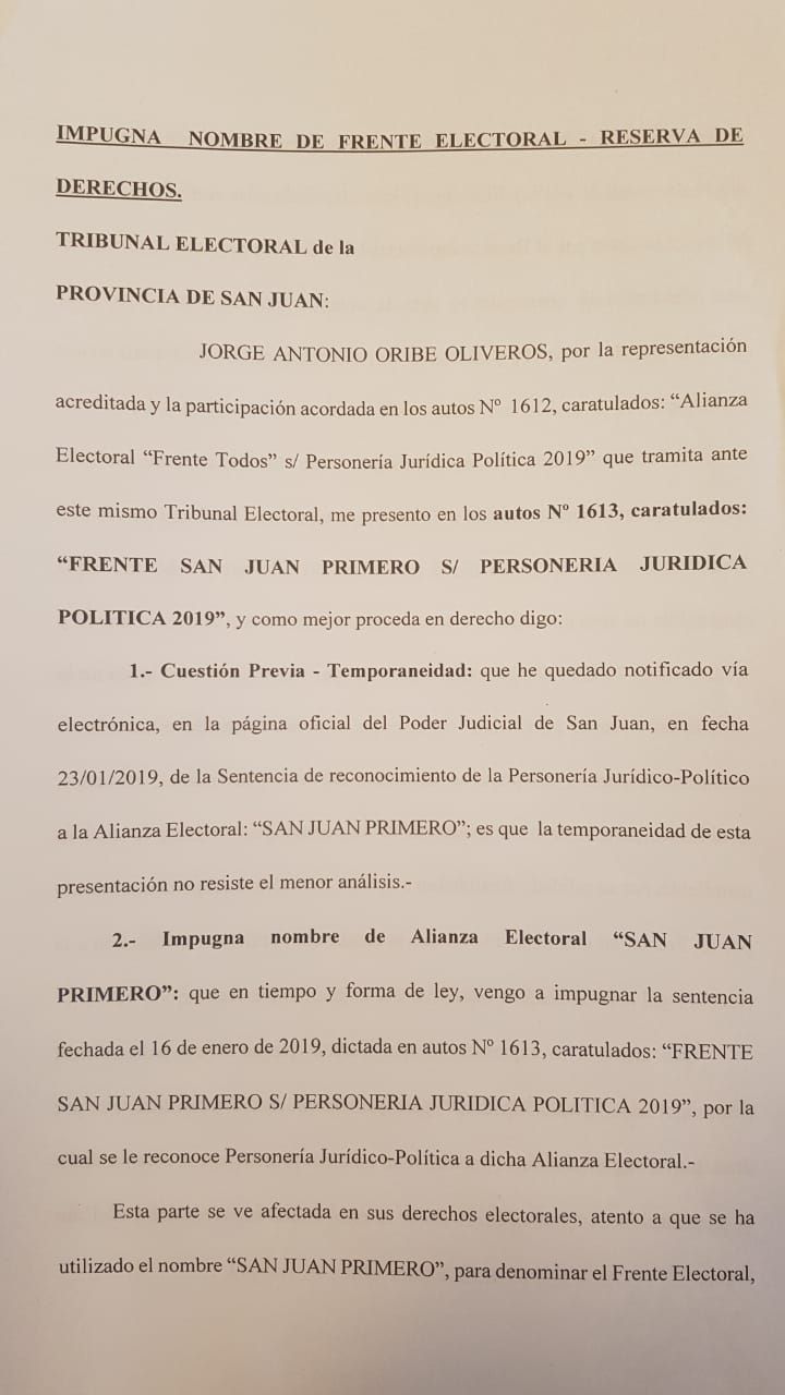 Este miércoles cuando el reloj marque las 23:59 expirará el tiempo para que cada frente electoral y partido presente sus precandidatos de cara a las PASO en San Juan. Pero a poco del cierre, el Frente Todos hizo este martes en la mañana una presentación ante el Tribunal Electoral de la provincia impugnando a uno de sus rivales: el Frente San Juan Primero. ¿Por qué? Argumentan que ese nombre fue utilizado por el oficialismo en las eleciiones legislativas del 2017.