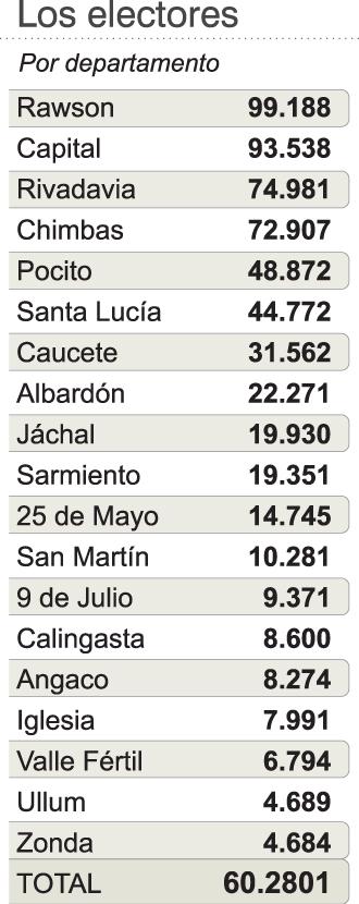 El padrón provisorio para el comicio del 14 de mayo arrojó un total de 602.801 electores, un 4 por ciento más que el de las legislativas nacionales, que fue de 579.913 personas habilitadas para votar. Los números reflejan que Rawson, Capital, Rivadavia, Chimbas, Pocito y Santa Lucía siguen estando en el lote de los seis departamentos con mayor cantidad de electores (ver infografía), los que contienen al 72 por ciento del total. Por ese motivo, todas las agrupaciones políticas centran sus cañones y ponen sus fichas en los distritos de mayor peso electoral.