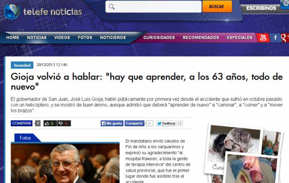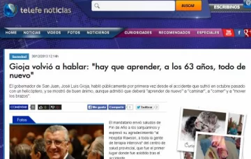 San Juan, 30 de diciembre.- Medios digitales nacionales de todo el país dieron un lugar de privilegio en sus portadas a las declaraciones que el primer mandatario provincial dio en exclusiva a DIARIO DE CUYO, luego del trágico accidente ocurrido el 11 de octubre pasado, en el que helicóptero en el que viajaba junto a funcionarios se desplomó, provocando la muerte de la diputada Margarita Ferrá de Bartol.