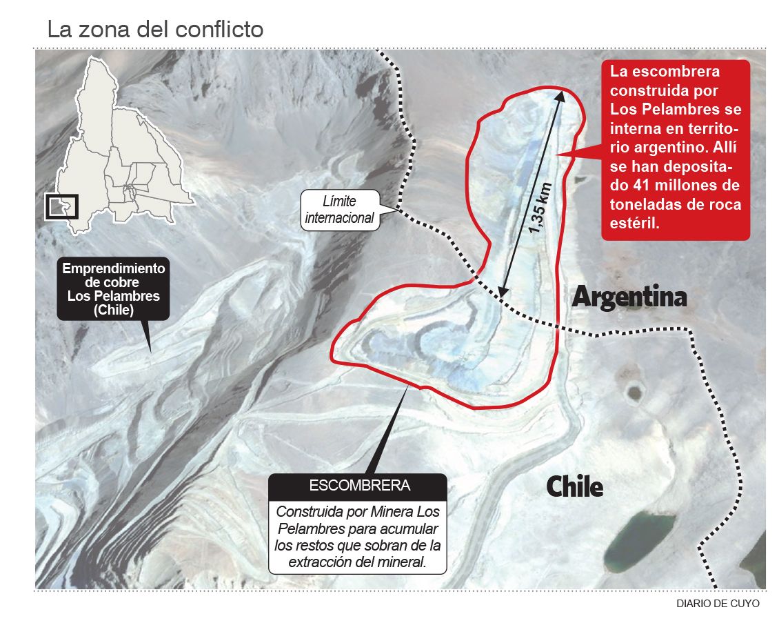 Los Pelambres fue depositando los 41 millones de toneladas de roca desde 2007 a 2012 y el conflicto estalló cuando la empresa Glencore radicó una demanda civil contra la minera chilena en 2014 y la denunció penalmente al año siguiente debido a que la escombrera se había construido en la zona que tiene bajo concesión para el proyecto de cobre El Pachón. Durante la gestión uñaquista, hubo acuerdo para que Los Pelambres sacara más de 500 neumáticos de los camiones fuera de ruta que estaban enterrados entre los escombros. Luego, Fiscalía de Estado, a cargo de Jorge Alvo, se hizo parte querellante en la causa penal y le solicitó al juez Rago Gallo la remoción de la escombrera, al igual que el fiscal Maldonado. El magistrado les dio el OK y, en audiencias con los directivos chilenos, ordenó el retiro y se acordó un plazo de 5 años y medio, más uno de prórroga ante posibles contingencias.