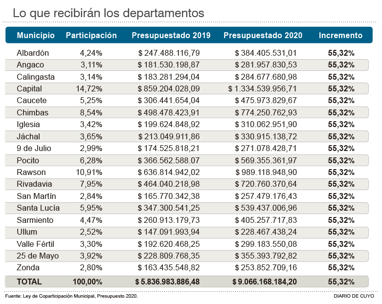 El equipo del Ministerio de Hacienda, que conduce Marisa López, le comunicó ayer a los diputados los lineamientos generales del proyecto de presupuesto 2020, ya que serán los encargados de tratarlo y aprobarlo. En el informe salió a la luz el cálculo del Gobierno sobre el monto que le distribuirá a los municipios en 2020 en concepto de coparticipación. La cifra total está por arriba de los 9 mil millones de pesos, lo que significa 3.229 millones más de lo que se pautó este año, es decir, un 55,32 por ciento de aumento.