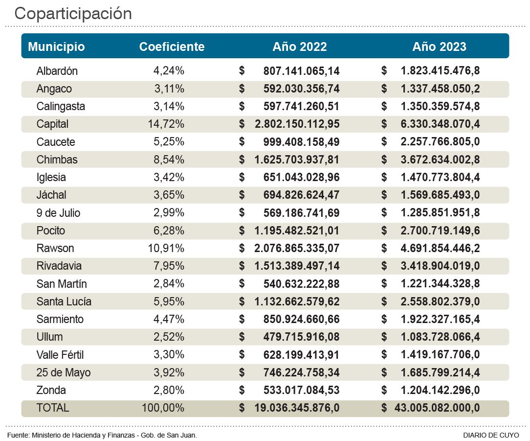 La coparticipación fue un mecanismo que implementó la gestión uñaquista para la distribución de partidas a los municipios a través de parámetros objetivos, en los que se determinaron coeficientes para cada uno de ellos (ver infografía). La "torta" de reparto se nutre del 20 por ciento de los recursos provinciales y el 14,5 de los de origen nacional, ambos de libre disponibilidad. Del total, el 92 por ciento va a coparticipación, por lo que en 2023 se calculan 43.005.082.000 pesos. Hay que tener en cuenta que son previsiones, ya que la cifra puede ser mayor si aumenta la recaudación nacional y provincial, la que inevitablemente hay que cotejar con la inflación, la que licúa los ingresos. Para todo este año se había presupuestado en coparticipación un total de 19.036.345.876 pesos, pero, a octubre, ya se habían distribuido 19.711.502.427,21 pesos. La plata de coparticipación es clave para los municipios, al punto que muchos de ellos utilizan entre el 80 y 90 por ciento para el pago de salarios.