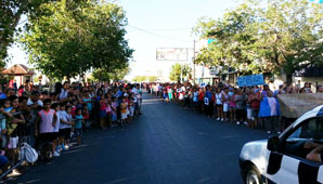 En ese lugar miles de personas, sobre todo chicos, lo esperaron con carteles y con ls brazos en alto para saludar al Gobernador de la provincia que sin salir de la movilidad se tomó el tiempo de saludar a todos los presentes.