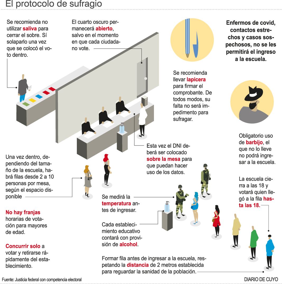 Con el objetivo de no generar inconvenientes el día de la elección y que parte del electorado interprete que tiene un horario específico para emitir su sufragio, desde el Juzgado Federal con competencia electoral de San Juan definieron que no habrá una franja horaria para las personas consideradas de riesgo por la pandemia del coronavirus. Así, dicho grupo podrá votar en cualquier momento de la jornada, cuando lo crea conveniente, desde el inicio a las 8 hasta cierra el proceso electoral a las 18. La medida implica un cambio respecto al protocolo que estableció la Cámara Nacional Electoral para el comicio del domingo, en el que definió un intervalo entre las 10.30 y las 12.30, para aquellas personas que son consideradas de riesgo, esto es, mayores de 60 años, personas con alguna enfermedad preexistente como presión alta o diabetes. Según indicó el secretario electoral nacional, Edgardo Benítez, ese grupo tendrá prioridad para votar en el momento que se presente en el establecimiento.