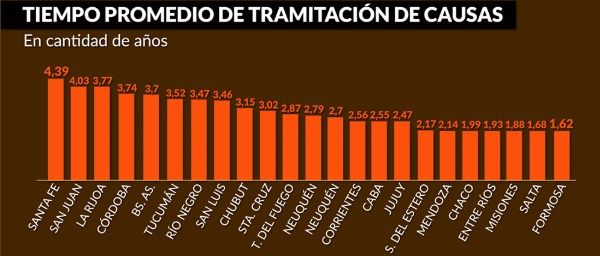 En cuanto al tiempo de tramitación de causas, la demora en San Juan supera los 4 años, convirtiéndola en la segunda provincia con más morosidad del país, detrás de Santa Fe.