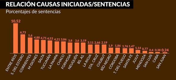 Por lo pronto, en este detallado trabajo de la Dirección de Estadísticas del Ministerio de Seguridad permite sostener que "la relación entre causas iniciadas respecto a las sentencias analizadas oscila entre un 10% y un 0,24%, siendo el promedio nacional cercano al 2%".