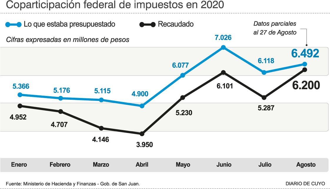 La pizca de recuperación lo que hace es evitar una profundización mayor en el descenso de recursos, ya que, en el acumulado de enero a julio, la baja era del 13,6 por ciento con respecto a lo que se había calculado recibir, por lo que, sumando todo agosto, en la cartera económica calculan que la merma puede estar entre el 11 y 12 por ciento. Así las cosas, sin tener en cuenta los números de recaudación provincial (que también vienen en caída), la provincia no ha embolsado unos 5.600 millones de pesos por coparticipación federal durante ocho meses en su presupuesto. Tamaña pérdida ha venido siendo compensada con 3.900 millones de pesos que el Estado local ha recibido del gobierno del presidente Alberto Fernández por Aportes del Tesoro Nacional (ATN) y devoluciones de deuda de la administración de Cambiemos, entre otras. Además, la gestión uñaquista hizo un fuerte recorte del gasto corriente, lo que le ha permitido a la cartera económica ir teniendo un déficit de deuda flotante manejable, al punto de que aún no ha sido necesario tomar ni parte del crédito del Banco San Juan por 3.000 millones de pesos aprobado por la Nación.