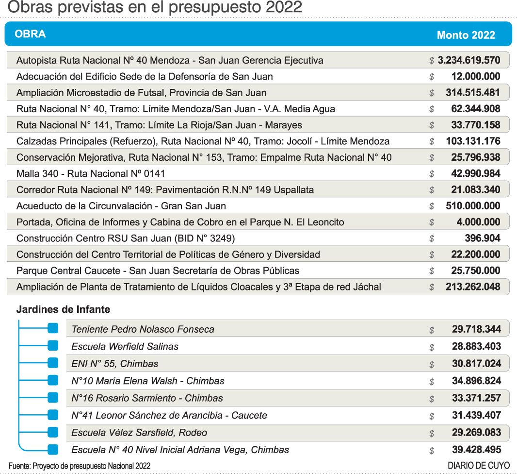 Los recursos por coparticipación federal son clave para San Juan, ya que representan, en promedio, el 77 por ciento de los fondos totales que la provincia dispone para todo un ejercicio. En esa línea, las proyecciones volcadas en el documento, que luego pueden ser modificadas por el debate en el Congreso, sirven como base para que el Ejecutivo local arme su propio presupuesto de cara al 2022. Además de los fondos por coparticipación, el proyecto enviado a la Cámara de Diputados de la Nación también contempla recursos para obras a desarrollar en la provincia o para tareas de infraestructura que ya están en marcha (ver infografía). A las que están plasmadas, se les debe sumar otras que se ejecutan gracias a convenios específicos, que no figuran en el documento pero que representan recursos clave en materia de obra pública nacional. Un ejemplo son las 4.800 casas que el presidente Alberto Fernández anunció para la provincia, de las cuales, 1.800 están en ejecución.