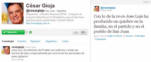 "Con lo de la re-re José Luis ha producido un quiebre en la familia, en el partido y en el pueblo de San Juan", "ante la consulta de varios compañeros reitero que no estoy de acuerdo y que me avergüenza la decisión tomada por mi hermano", "José, siento un profundo dolor por una decisión que nuestros padres jamás aprobarían", "respetar la palabra empeñada es lo que nos enseñaron","Perón dijo primero la Patria, luego el movimiento y por último los hombres, no al revés", "José Luis, nuestros padres no nos enseñaron que modificar las leyes o la Constitución a nuestro provecho es bueno", "la democracia no se declama, se respeta", "Con dolor digo que me avergüenza la decisión tomada por mi hermano, no comparto modificar la Constitución para su re-re", "José Luis, la medida fue inconsulta y responde al interés personal de darle continuidad a tu gestión al frente del gobierno", "Siento la obligación fraternal, ética, moral y política de expresar contundentemente que estoy en desacuerdo con la enmienda para la re-re", "La re-re no es democrática porque no respeta las reglas de juego de jerarquía constitucional ni la alternancia del poder", "José Luis, los intereses del pueblo son sublimes y están por encima de todo y especialmente por encima de los personales de quien gobierna". Todo esto escribió César en su twitter desde su celular, marcando una fisura familiar y política que lo pone al senador en la vereda de enfrente del gobernador y como eventual opositor en la interna del 14 de agosto.