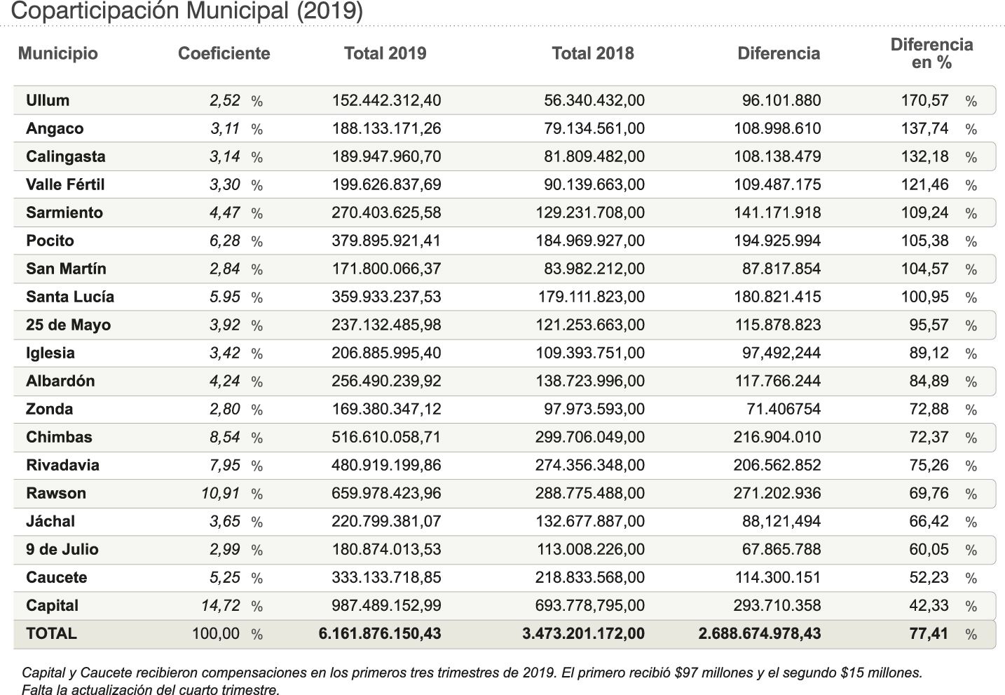 Al definir los coeficientes de distribución a los departamentos, Capital perdió 4,5 puntos y Caucete poco más de uno, debido a que en gestiones anteriores se habían sobrevaluado sus porcentajes. Pese a ello, ambas comunas recibieron más recursos que en 2018, pero por debajo de la inflación interanual. La ley de coparticipación previó esa situación y se dispuso que ningún municipio iba a embolsar menos fondos comparados con la suba del índice de precios. De esa forma, Capital recibió 97 millones de pesos de compensación y Caucete 15 millones, ambos, por los tres primeros trimestres de 2019. Así, queda el análisis del último cuatrimestre, por lo que, si siguen desfasados, recibirán una actualización en enero, informaron en el Ministerio de Hacienda.