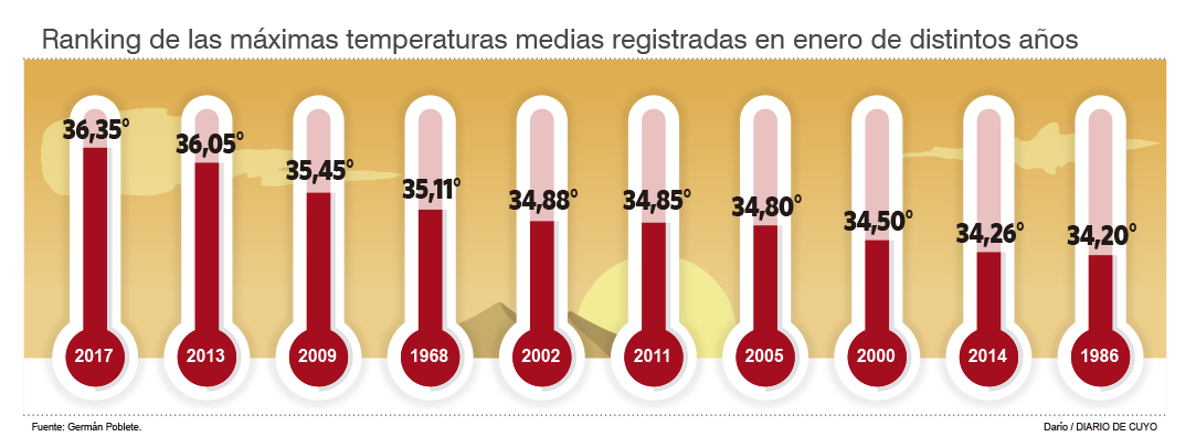 Desde fines de diciembre el calor se instaló en la provincia e hizo que San Juan se volviera, varias veces, la más caliente del país. Según Poblete, a fines del 2016 ingresó una masa tropical cálida y húmeda que hizo que el termómetro estuviera al tope. Así fue que durante casi el 70% del mes (21 días) de enero la temperatura fue superior a los 35ºC.