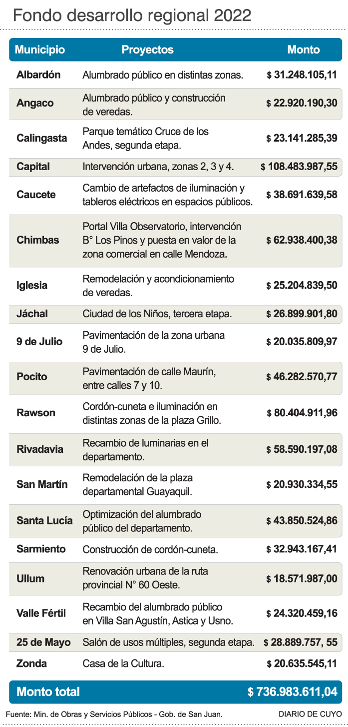 El mes que viene, la gestión uñaquista comenzará a distribuir a los municipios parte de los casi 737 millones de pesos correspondientes al Fondo de Desarrollo Regional (Fodere). Con ese primer desembolso, que comprende un anticipo financiero, las comunas podrán dar inicio a obras clave para los vecinos, entre las que se encuentran alumbrado público, pavimentación y proyectos turísticos, entre otros. Según confirmaron desde el Ministerio de Hacienda, que conduce Marisa López, se espera que, durante esta semana y la que viene, se concluyan 15 decretos con la financiación de las iniciativas municipales, mientras que los cuatro restantes "están en camino de definición", por lo que el primer desembolso "se hará el mes que viene". Todas las propuestas han tenido el visto bueno de la Dirección de Hábitat e Infraestructura Municipal, a cargo de Manuel Pandolfini, por lo que cada distrito podrá encarar las obras previstas.