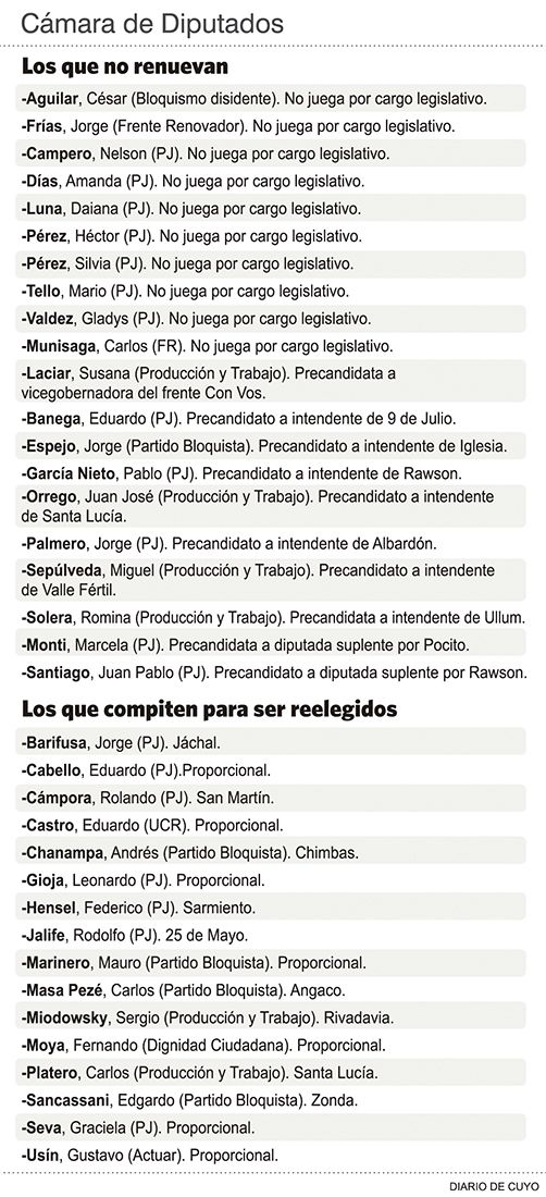 Después figura todo un lote de actuales diputados, de distintos partidos, que busca repetir, ya sea como representantes departamentales o a través del sistema proporcional, es decir, de acuerdo a la cantidad de votos que obtenga cada fuerza política. En estos casos, los que pierdan en los comicios o queden fuera por no alcanzar el número de sufragios suficiente se sumará al grupo de los que estarán afuera de la próxima conformación de la Cámara de Diputados. Su composición contempla a 19 diputados departamentales y 17 proporcionales.