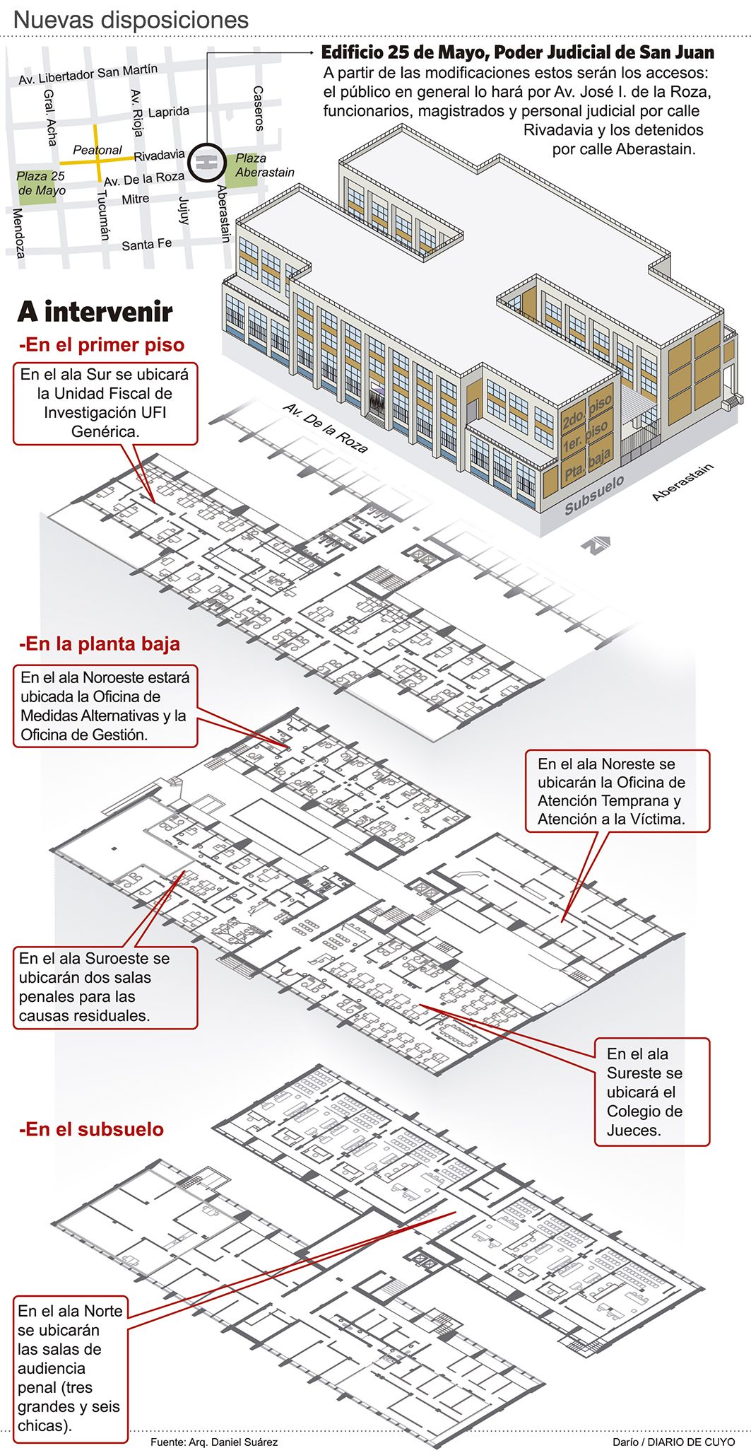 Entre las modificaciones, el llamado Colegio de Jueces (de control de garantías y de impugnación) estará ubicado en el lugar de la planta baja que ocupaban los recintos para juicios de la Sala II y III de la Cámara Penal, además de que se usarán los despachos de esta última sala. Al mudarse los juzgados civiles del primer piso, liberaron un ala que será ocupada por la Unidad Fiscal de Investigación (UFI) Genérica, que tendrá las causas de asesinatos, homicidios culposos (accidentes de tránsito y mala praxis médica) y delitos contra la administración pública. En la otra ala quedarán el Segundo y Tercer Juzgado Correccional y el Tercero y el Quinto de Instrucción, más la Unidad Conclusiva de Causas para la resolución de los casos del viejo sistema. Las otras Unidades Fiscales son las que investigan hechos de violencia de género (Cavig) y ataques sexuales contra menores (Anivi). En esta última, los fiscales estarán ubicados en el inmueble de Rivadavia antes de Caseros. En el segundo piso, donde están los despachos de los cortistas y del fiscal General, los retoques serán menores.