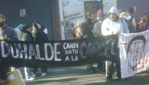Ahora, mientras Duhalde asistió al canal de aire América TV, para participar del programa Almorzando con Mirtha Legrand, militantes del Frente Darío Santillán se acercaron hasta la puerta del canal, ubicado en el barrio porteño de Palermo, para manifestar contra el bonarense.