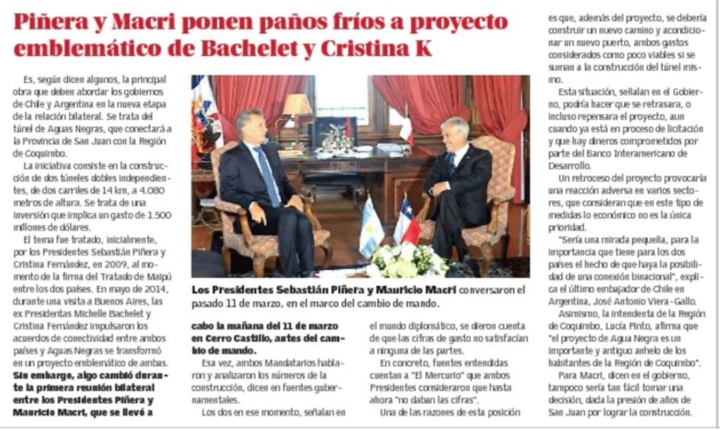 La nota que publicó el último domingo el diario El Mercurio, de la sección “dicen que” y que no lleva la firma de ningún periodista, causó gran revuelo en Chile y San Juan. Es que según el periódico, “Piñera y Macri ponen paños fríos” al Túnel de Agua Negra.