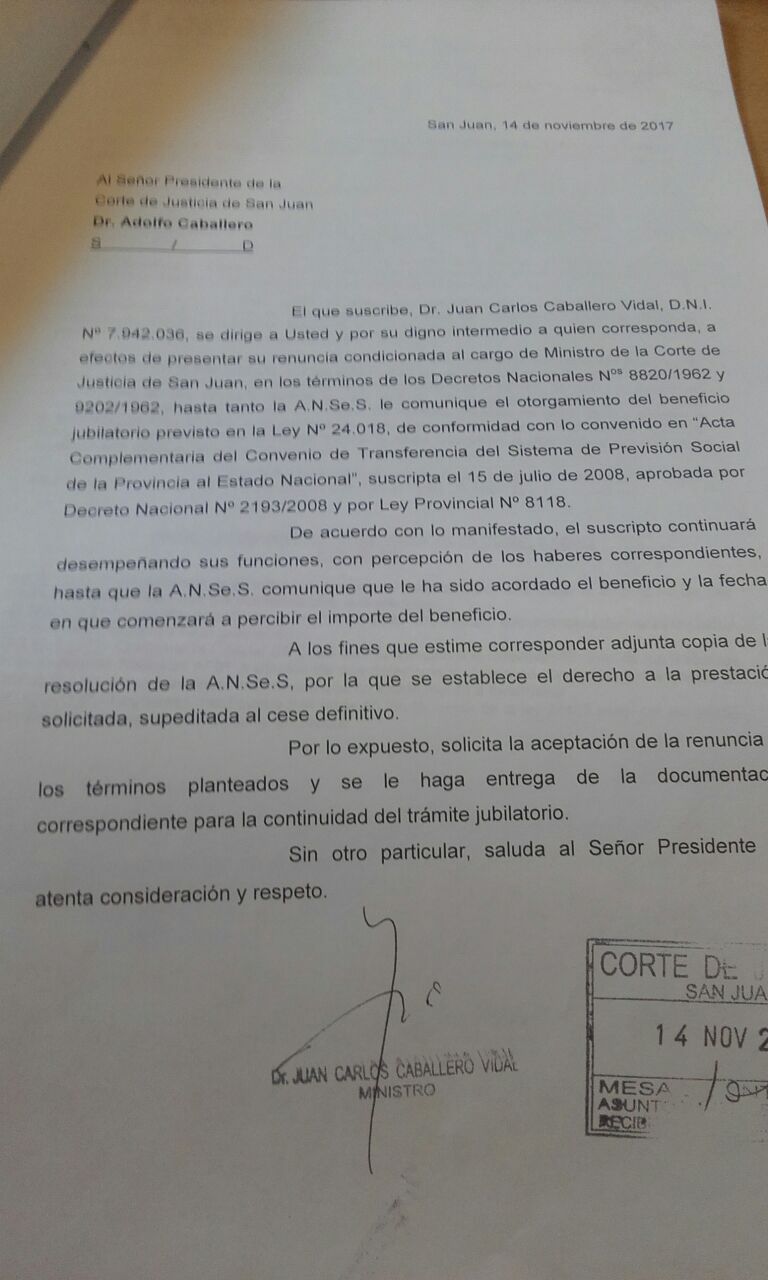 El que suscribe, Dr. Juan Carlos Caballero Vidal, D.N.I. número 7.942.036 se dirige a usted y por su digno Intermedio a quien corresponda, a efectos de presentar su renuncia condicionada al cargo de Ministro de la Corte de Justicia de San Juan, en los términos de los Decretos Nacionales N°. 8820/1962 y 902/1962, hasta tanto Ia A.N.Se.S. le comunique el otorgamiento del beneficio jubilatorio previsto en la Ley N° 24.018, de conformidad con lo convenido en el Acta Complementaria del Convenio de Transferencia del Sistema de Previsión Social de la provincia al Estado Nacional, suscripta el 15 de julio de 2008, aprobada por Decreto Nacional 193/2008 y por Ley Provincial N° 8118.