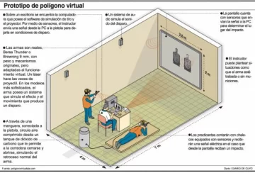 Los practicantes utilizarán las armas reglamentarias de la Policía, sólo que sin proyectiles ya que estarán adaptadas a un funcionamiento y a un escenario virtual, en el que se enfrentarán a blancos a diferentes distancias y diversas situaciones como toma de rehenes, asaltos o enfrentamientos armados (ver infografía). La cantidad de disparos es ilimitada, lo que facilita una práctica aceitada y fluida. Inclusive tienen previsto que los efectivos policiales que están en actividad utilicen el sistema y realicen disparos de prueba.