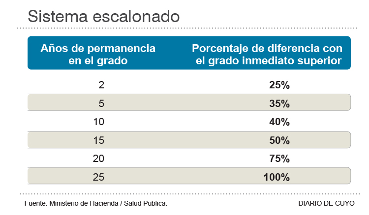A partir de enero del año que viene, unos 1.000 profesionales de la salud, que tengan más de 15 años de servicio en el mismo puesto dentro de Salud Pública, comenzarán a cobrar un extra en su sueldo. El incremento se denomina "Adicional por Permanencia en el Grado" e implica un reconocimiento a ese trabajador que no ha podido subir en el escalafón sanitario. Es que el Estado no ha podido llevar adelante la carrera sanitaria, la que está prevista en la ley que regula la actividad. La suba no será para todos igual, ya que tendrá en cuenta la cantidad de años que el profesional lleva en el puesto, la que, a su vez, determinará el porcentaje de aumento que percibirá. Según quedó establecido en la norma que ya fue aprobada, el reconocimiento tendrá en cuenta el grado superior que debería estar ocupando el profesional y, así, el Estado le pagará la diferencia de sueldo, la que podrá ser total o parte de ella, dependiendo de los años. Los profesionales a los que se les aplicará el beneficio son médicos, odontólogos, bioquímicos, químicos, psicólogos, bacteriólogos, farmacéuticos, obstetras, dietistas, fonoaudiólogos, kinesiólogos, terapeutas y enfermeros diplomados, todos aquellos que son parte de la Ley 71-Q.