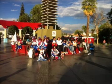 La más importante fue en las gradas ubicadas sobre calle Ingeniero Krause pero todo el color estuvo presente sobre la plaza donde la organización había destinado un escenario para que artistas calentaran la previa de la visita de Scioli.