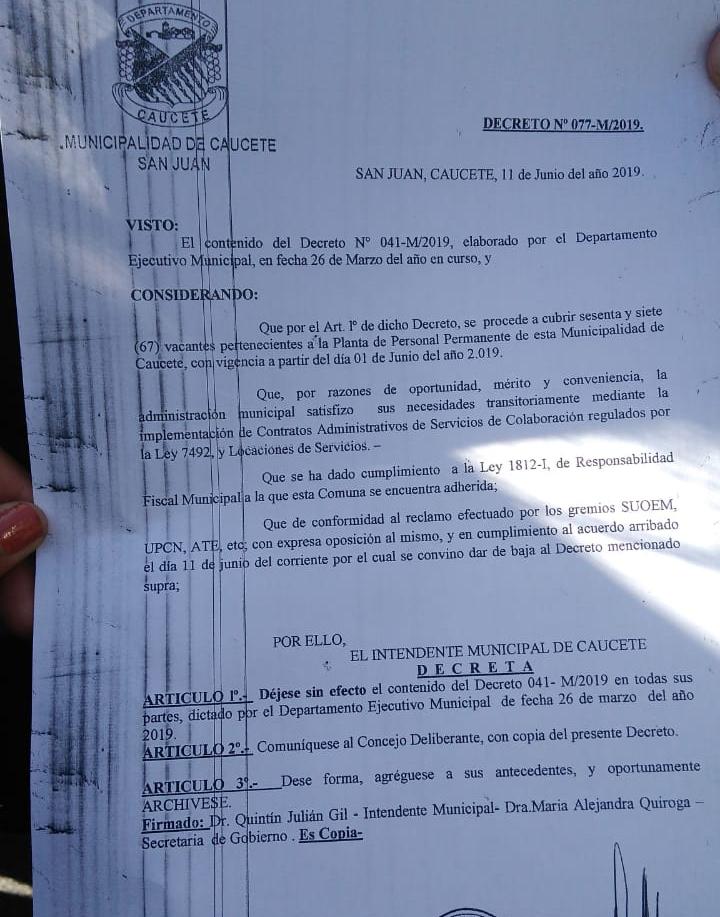 El intendente de Caucete, Julián Gil, dejó sin efecto el polémico decreto por el que nombraba a 67 personas en planta permanente. La determinación la tomó después que unos 100 trabajadores reclamaran en la puerta del municipio.