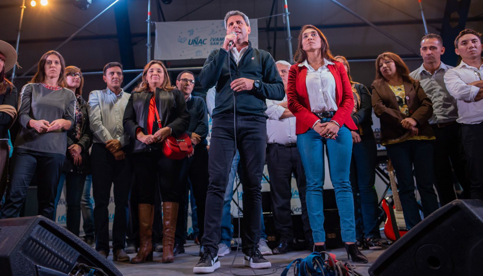 Unidad. El Frente Todos llevó adelante un acto político en la Unión Deportiva Caucetera. Ahí, tanto Romina Rosas como Sergio Uñac apuntaron contra la conducción departamental de Julián Gil.