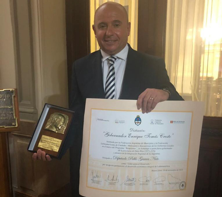 El Senado distinguió al diputado provincial Pablo García Nieto con el premio "Líderes para el Desarrollo Integral para Latinoamérica, Gobernador Enrique Tomas Cresto". El galardón fue por el mérito a su trabajo en beneficio de la comunidad y progreso de sus sociedades. Tras la distinción, el legislador se comprometió a seguir trabajando por San Juan.
