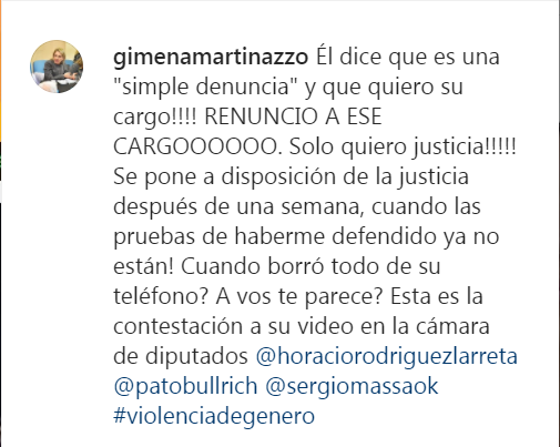 Cáceres, en forma remota, dijo ser "víctima" de una falsa denuncia y agregó que la causa es “por bronca, por despecho o por una finalidad política”. Martinazzo comenzó su posteo en Instagram asegurando que renuncia al cargo,