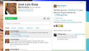 San Juan, 23 de octubre.- Pasadas las 18.30, el mandatario provincial, José Luis Gioja utilizó la red social Twitter para agradecerles a los sanjuaninos por la reelección de Cristina Fernández de Kirchner.
