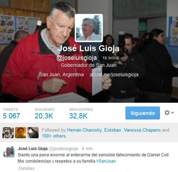 San Juan 6 de marzo.- Minutos después de hacerse pública la noticia del fallecimiento del dirigente justicialista, el primer mandatario provincial, jefe político de Daniel Coll en la última década, expresó su penar por el deceso.