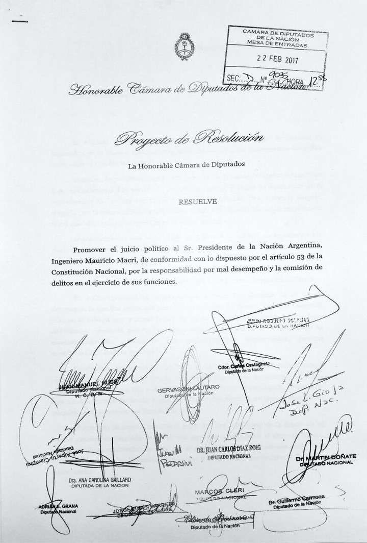 Un grupo de diputados del Frente para la Victoria presentó esta tarde un pedido de juicio político contra el Presidente. Alegan "responsabilidad por mal desempeño y la comisión de delitos en el ejercicio de sus funciones".