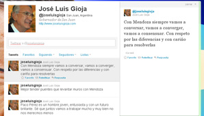 San Juan, 25 de octubre.- La polémica sigue y parece no detenerse. Luego de las polémicas declaraciones del flamante gobernador electo de Mendoza, en las que tildó a José Luis Gioja de "vende humo", el mandatario sanjuanino le contestó a través de su cuenta de Twitter, intentando poner paños fríos al asunto. Sin embargo, más tarde contraatacó.