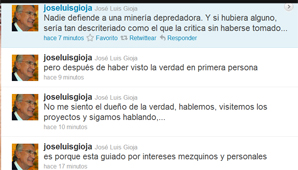 “Nadie defiende a una minería depredadora. Y si hubiera alguno, sería tan descriteriado como el que la critica sin haberse tomado. la molestia d e venir a ver la verdad.”, dice uno de sus twit.