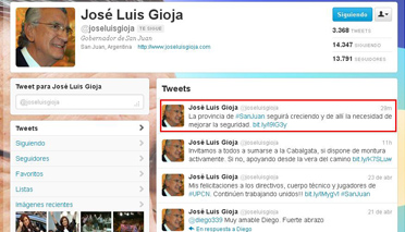 San Juan 25 de abril.- La seguridad o inseguridad, desde la óptica que se analice el tema, es materia de discusión cotidiana en la sociedad sanjuanina. Por este motivo es que el primer mandatario provincial, envió un claro mensaje a la ciudadanía vía twitter: “la provincia de San Juan seguirá creciendo y de allí la necesidad de mejorar la seguridad”.