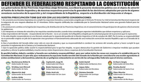 Además, denuncian que "se promueven cambios en la legislación impositiva y de distribución de las Provincias Argentinas sin el consentimiento ni la participación de quienes efectivamente las gobiernan" y que "se interpreta un sistema de votación y los requisitos constitucionales, cuando éstos constituyen aspectos indubitables que deben respetarse y aplicarse".