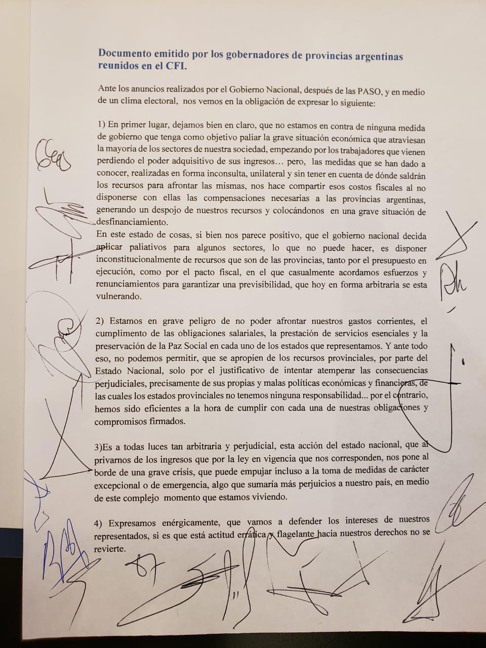 Gobernadores peronistas, incluido Sergio Uñac, se juntaron este miércoles en el Consejo Federal de Inversiones (CFI) y firmaron un duro documento para criticar a la Casa Rosada por el paquete de medidas económicas que se tomaron después de las elecciones Primarias Abiertas Simultáneas y obligatorias (PASO). Sin embargo, aclararon que no están en contra de las mismas, sino de la manera en la que se implementaron.