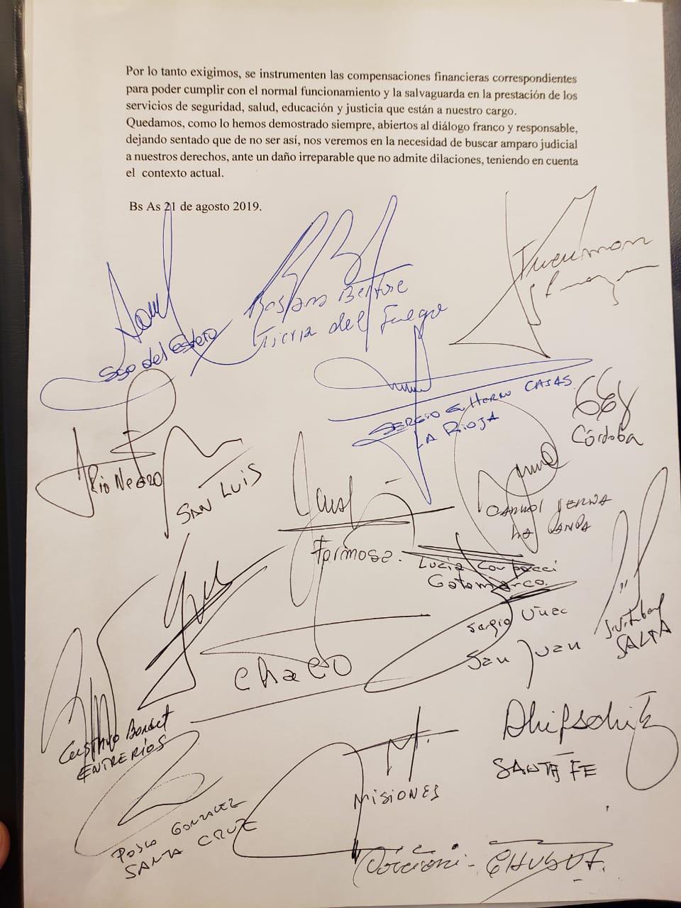 "Es a todas luces tan arbitraria y perjudicial esta acción del Estado Nacional que al privarnos de los ingresos que por la ley en vigencia nos corresponden, nos pone al borde de una grave crisis que puede empujar incluso a la toma de medidas de carácter excepcional o de emergencia, algo que sumaría más perjuicio a nuestro país", explican.