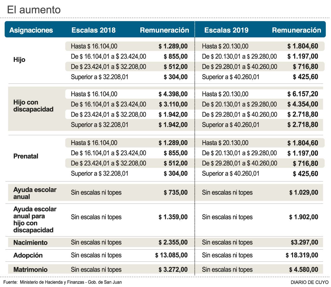 De acuerdo al decreto de reglamentación de la ley, cobran las asignaciones familiares los empleados en relación de dependencia con el ámbito estatal, de todas las categorías y de los tres poderes del Estado: Ejecutivo, Judicial y Legislativo. La suba será del 40 por ciento con respecto al año pasado. El beneficio contempla ocho rubros: hijo, hijo discapacitado, prenatal, ayuda escolar anual, ayuda escolar anual para hijo discapacitado, nacimiento, adopción y matrimonio. Son estos ítems los que experimentarán un aumento del 40 por ciento. Los tres primeros contemplan cuatro escalas, es decir, a que tramo salarial le corresponde tal o cual asignación. Por ejemplo, hasta una remuneración de 20.130 pesos, un empleado cobrará 1.804,6 pesos por hijo. Dicha escala subió un 25 por ciento con respecto a 2018, que estaba en 16.104 pesos. Y tal porcentaje se aplicó al resto de las escalas (Ver infografía). De acuerdo al lineamiento implementado, los trabajadores que perciben menos ingresos embolsan una ayuda superior en concepto de asignación. Y una característica del régimen provincial es que no hay topes salariales, por lo que montos superiores a 40.260 pesos también cobran el beneficio, aunque en una cifra menor.