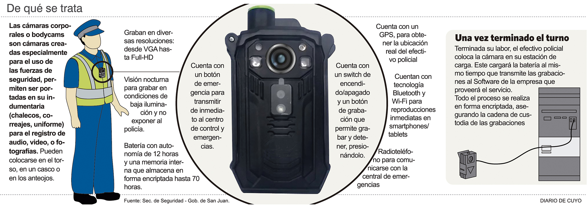 En cuanto a las últimas incorporaciones, Munisaga explicó que esta semana llegarán las 50 cámaras corporales (ver infografía), cuya inversión fue de 8 millones de pesos, en el que se incluye el servicio técnico y de almacenamiento. Habrá capacitación para los uniformados y en febrero saldrán a las calles con el equipamiento. El funcionario indicó que el registro le sirve al policía como resguardo si su actuación fue la correcta en un procedimiento. En cambio, si su accionar fue irregular, es una herramienta de defensa para el ciudadano. "La idea es ampliar la cantidad", dijo Munisaga.
