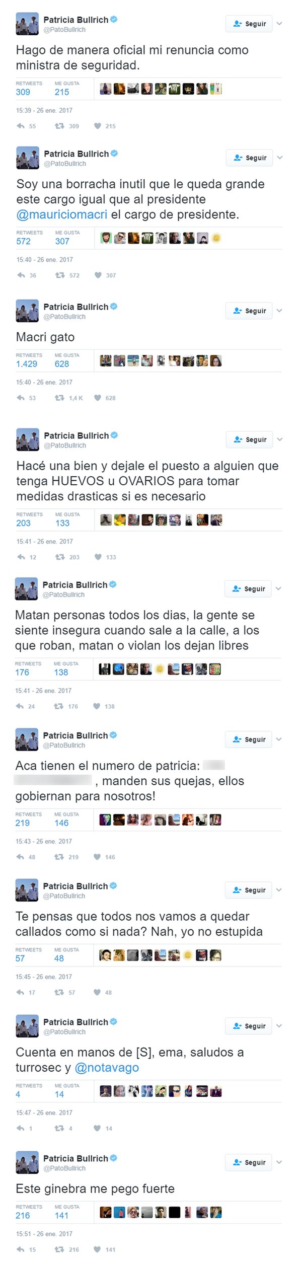 "Hago de manera oficial mi renuncia como ministra de seguridad", comienza la catarata de posteos, que finalizan con una adjudicación: "Cuenta en manos de [S], ema, saludos a turrosec y @notavago".