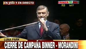 En su discurso, Binner llamó además a ‘construir una nueva Argentina; vamos a nacionalizar; vamos a cambiar porque en el cambio está la fuerza que necesitamos para construir un país mejor. ¡A construir la esperanza!‘, exhortó eufórico el candidato del FAP.