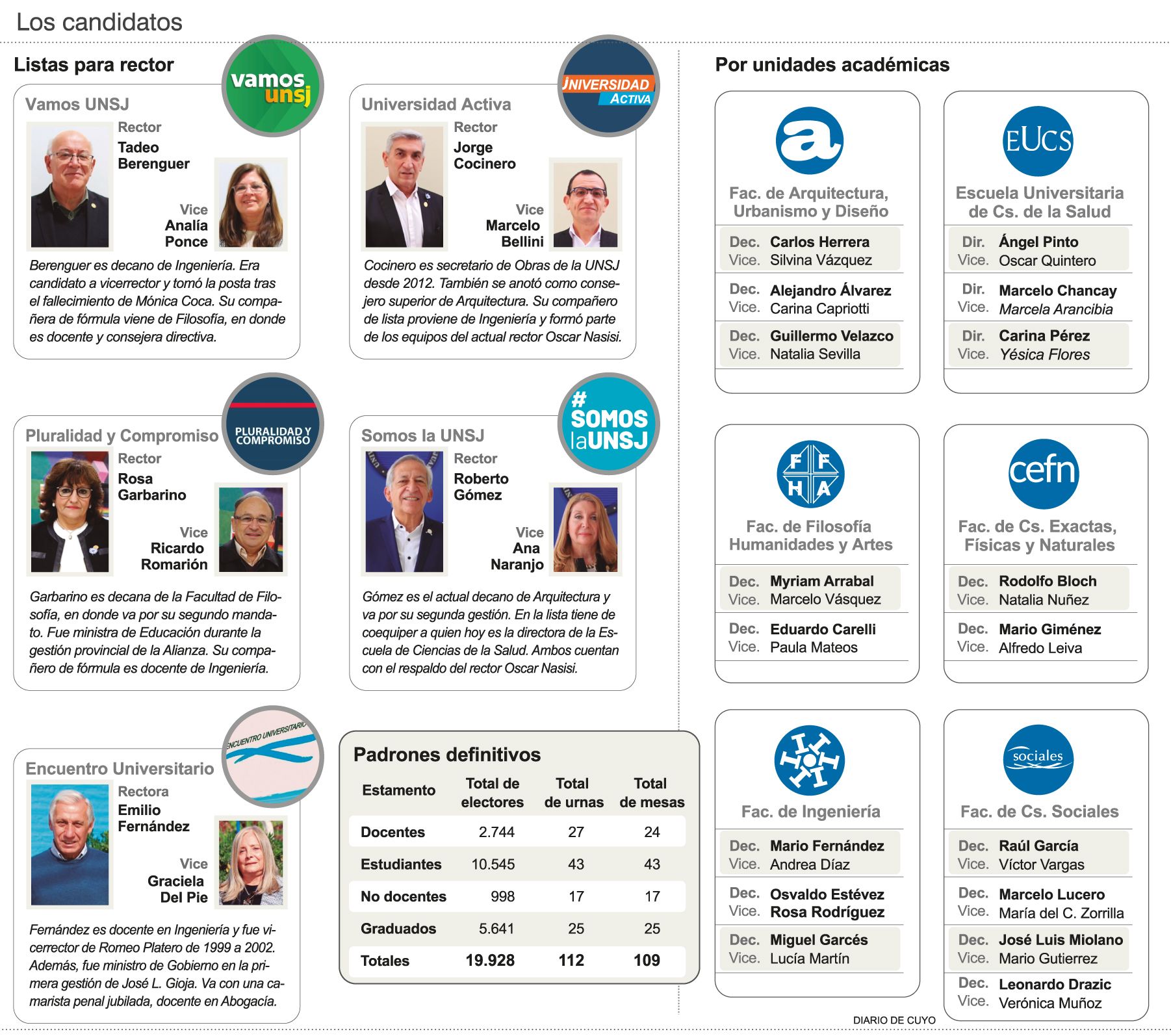 La elección en la Universidad Nacional de San Juan (UNSJ) no sólo pasará a la historia porque estuvo atravesada por la pandemia del coronavirus, sino también por los conflictos que se desataron en el arduo camino hacia las urnas, al punto de que hay temor de que un fallo judicial pueda anular los resultados. ¿El motivo? El hecho de que docentes interinos regularizados puedan votar y ocupar cargos ejecutivos y colegiados cuando la ley de Educación Superior sólo lo contempla esos derechos políticos para quienes hayan concursado sus cargos, según el planteo de una consejera. De acuerdo a fuentes del Ministerio de Salud Pública, el protocolo para sufragar tuvo el visto bueno (sólo faltaba la resolución), luego de que también sufriera idas y vueltas. De esa manera, cinco candidatos se enfrentarán para conquistar el sillón del Rectorado, una competencia que tuvo duros cruces. A su vez, otros 17 postulantes van por la conducción de las cinco facultades y la escuela universitaria (Ver infografía).