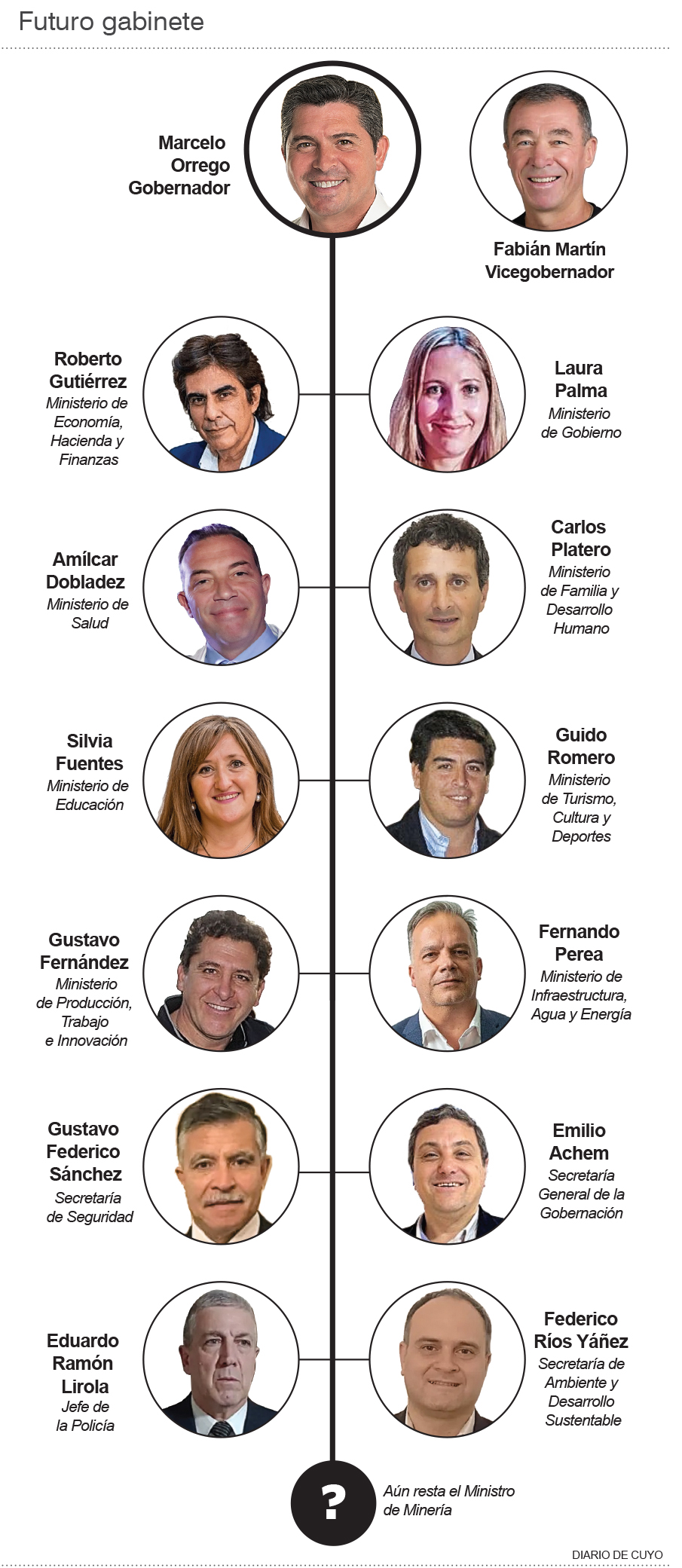 Con los 3 nuevos funcionarios que confirmó este viernes Marcelo Orrego, ya le puso nombre y apellido a 12 de los 13 principales cargos. Lo que en política se conoce como "primeras líneas". La única incógnita a esta altura, a días de la asunción, es quien ocupará el sillón de ministro de Minería.