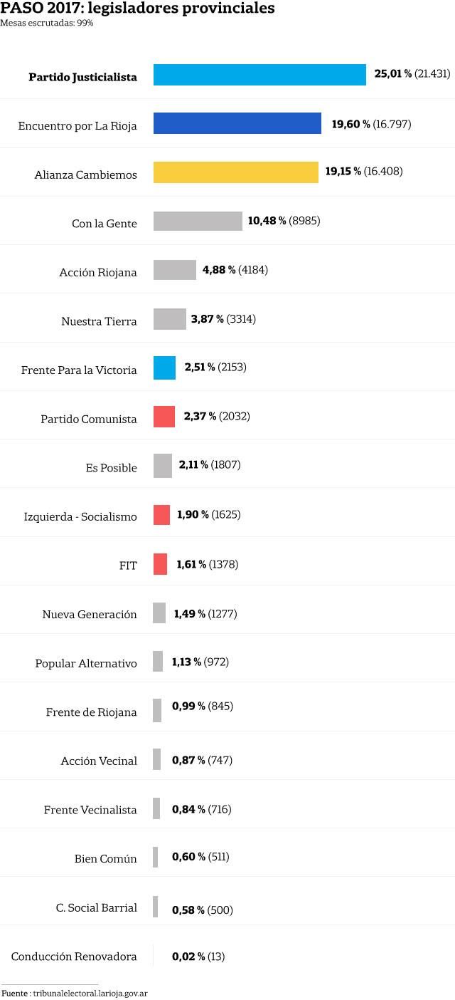 En La Rioja, donde ayer se celebraron las PASO para elegir legisladores provinciales, triunfó el Partido Justicialista y el segundo lugar se disputaba entre Encuentro por La Rioja (otro sector del PJ) y Cambiemos.